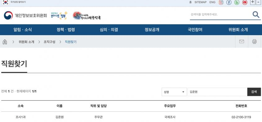 2. 글에 김준원 주무관이라고 하는데 실제로 개인정보보호위원회에 그런 직원분이 있음. 소속, 직위도 조사 1과, 주무관 맞고 주요 업무도 파라과이라 그런지 국제조사로 나옴.