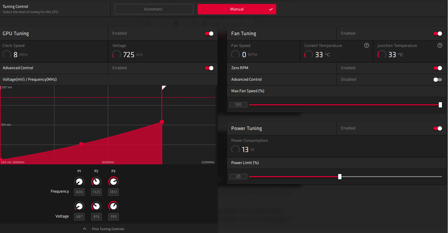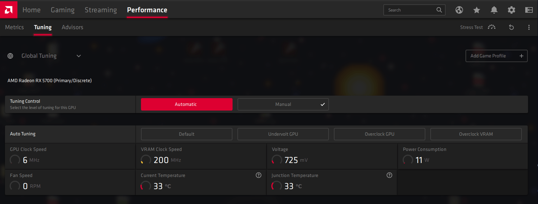일반적인 오버 클러킹의 경우 Radeon Wattman 이 사용됩니다. 이것은 AMD의 드라이버 제품군과 함께 제공되는 내장 도구입니다. 액세스 하려면 먼저 Radeon Software를 시작하십시오 (바탕 화면의 빈 공간을 마우스 오른쪽 버튼으로 클릭하여 찾을 수 있음). 드라이버에서 Tuning이라는 헤더로 이동하기 전에 Performance 탭으로 이동합니다. 위험을 감수하면 다음과 같은 화면이 표시됩니다.