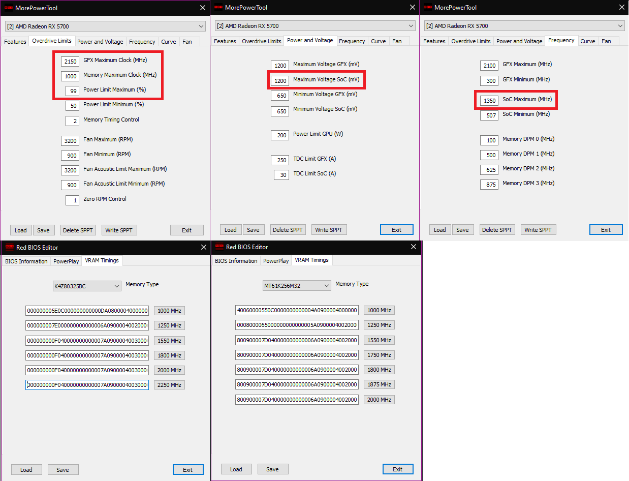 변경된 두 번째 섹션은 전압이어야 합니다. LN2를 사용하지 않는 한, 모든 설정을 한 가지 설정으로 남겨 두는 것이 좋습니다. 최대 전압 SOC는 코어에 맞게 최대 1200mV까지 설정할 수 있습니다. 이것은 나중에 다음 조정을 위해 중요합니다. SOC 최대 값 (MHz)을 1350으로 올리십시오 (설정은 주파수 탭 아래에 있습니다). 여기에서 완료되면 MPT를 저장하고 잠재적으로 Soft Power Play 테이블에 설정을 쓸 수 있습니다 ( 인터페이스에서 ' Write SPPT '). 그렇게 한 경우 시스템을 재부팅하십시오. 모든 사람에게 작동하지 않을 수 있습니다. 필요한 경우 도구 페이지의 지침에 따라 BIOS 파일에 기록하십시오.