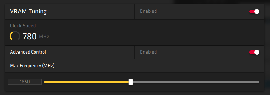 VRAM의 기본 제한 인 1860 MHz는 모든 경우에 저에게 안정적이지 않았습니다. 하지만 1850 MHz였습니다.