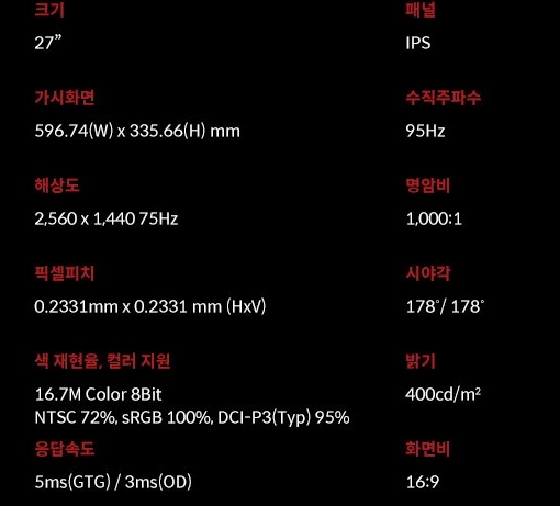 아 그리고 내 가살 때는 75hz 리얼이었는데 지금은 오버클럭 해서 95hz로 나옴 그런데 가격도 올랐네 ㅋㅋㅋㅋ
