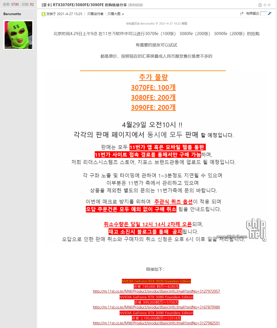 本帖最后由 Berumotto 于 2021-4-27 19:22 编辑 北京时间4.29日上午9点 在11번가软件中可以进行3070fe(100张) 3080fe(200张) 3090fe(200张)的抢购 有需要的朋友可以试试 都是原价,按照现在的汇率换算