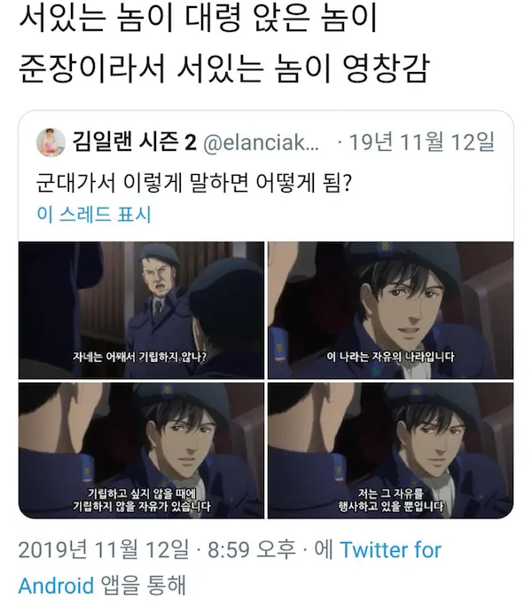앉은애가 준장이면 허허 그래그래 다같이 일어나는데 나만 빠질순 없지 하면 앉은애 옆에 애가 이새끼가 돌았나 해야지