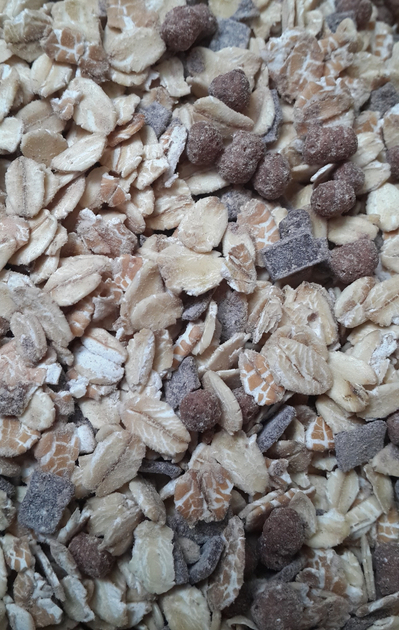 내용물을 보면 저렇게 초콜릿 칩하고 귀리 하고 섞였다 간간히 초콜릿 프레이크도 있다