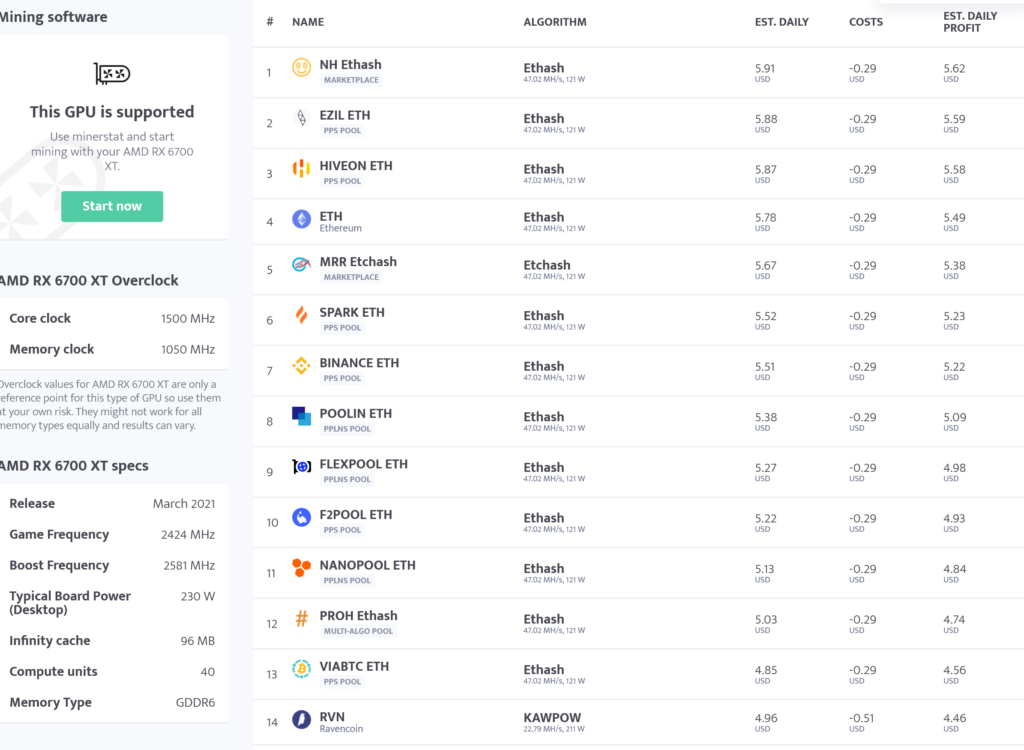 숫자를 보면 무슨 뜻인지 알 수 있을 거예요. Ether 해시가 제한된 상태에서 RTX 3060은 Raven, Conflux 및 Turtle과 같은 대체 통화로 제한됩니다. 그러나 이들은 Ether보다 훨씬 수익성이 낮습니다. Radeon RX 6700 XT는 Ether에서 거의 50 MH/s의 해시 속도를 관리하므로 일일 수익이 6달러에 가깝습니다. Navi 22 부품으로 상당히 쉬운 메모리 오버 클러킹을 사용하면 52-53 MH/s까지 도달할 수 있어 더욱 매력적이며 RTX 3070의 60 MH/s에 가깝습니다.