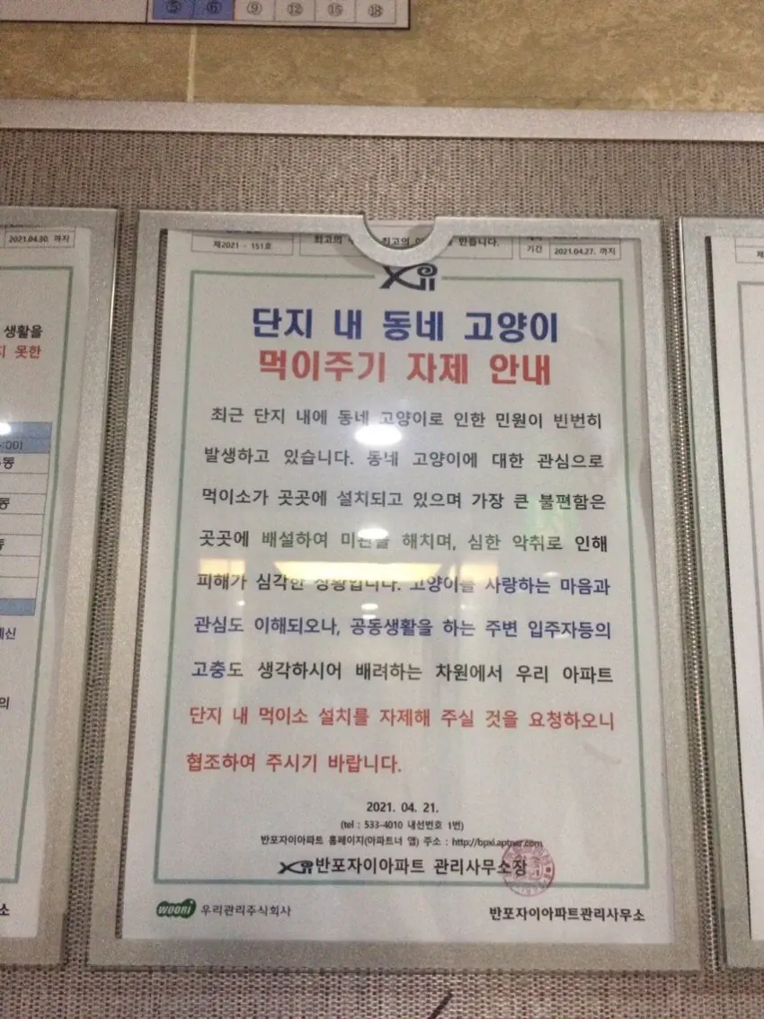 반포 자이 아파트에서 길고양이에게 밥을 주지 말라는 게시글과 길고양이집 훼손 금지 글이 같이 올라옴