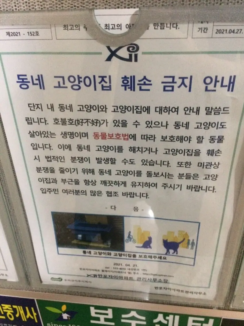 길고양이집 훼손 금지 글은 관리사무소장 직인이 안 찍혀 있는걸로 봐서 조작글로 의심 됨