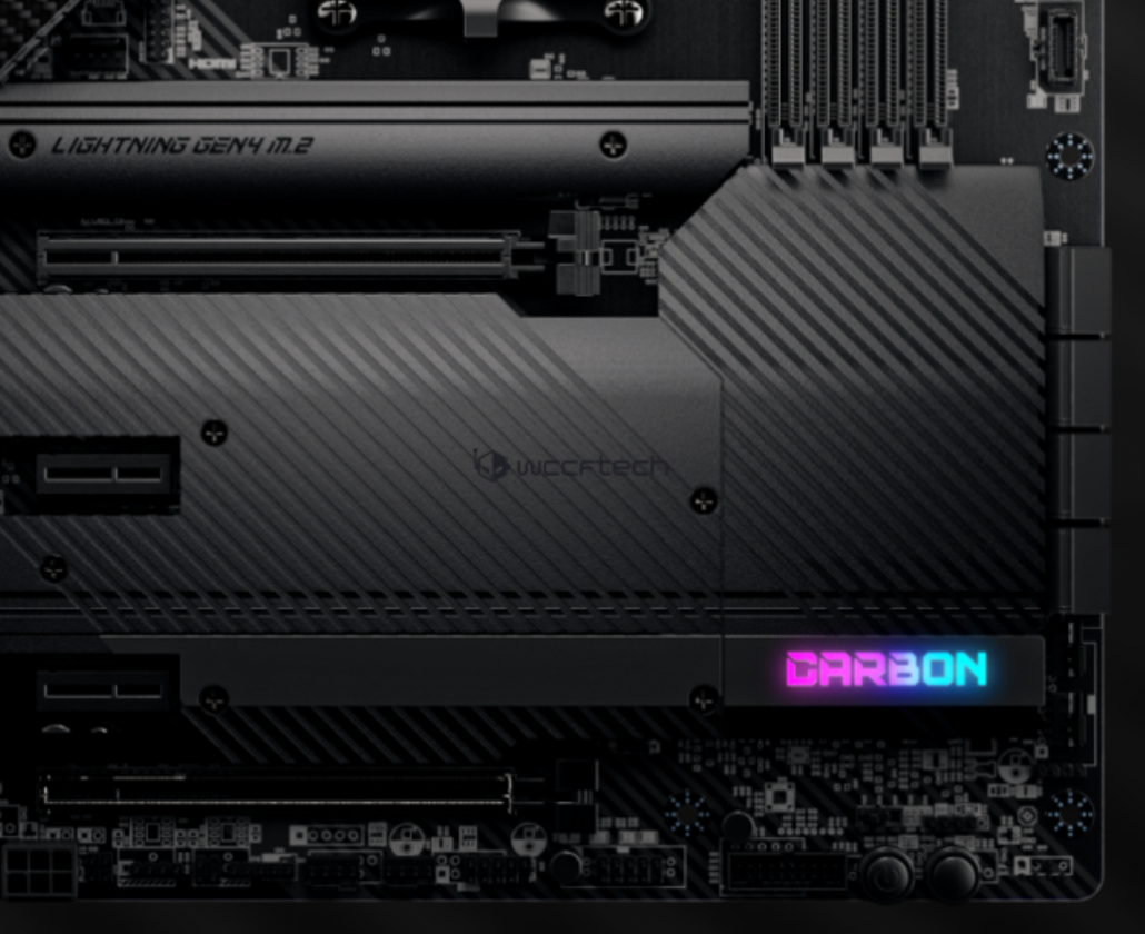 이전 X570 Carbon과 비교했을 때, 우리는 알루미늄 기반 히트싱크, 더 큰 M.2 히트싱크, 더 많은 SATA 포트를 가진 완전한 팬리스 PCH를 찾을 수 있습니다. 또한, 더 나은 I/O와 향상된 VRM 영역을 제공할 것으로 예상할 수 있지만, 이는 두고 봐야 합니다.