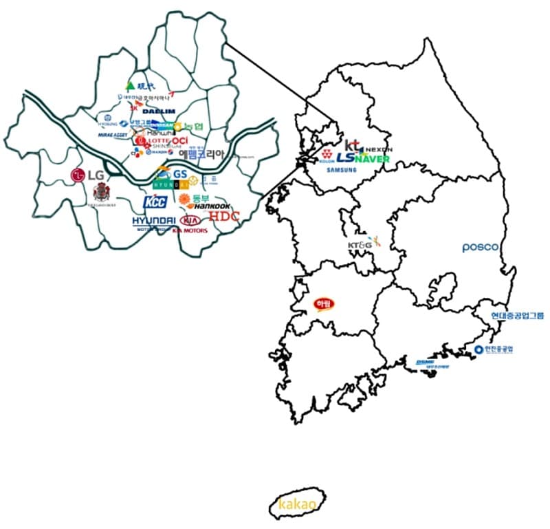 나라별 대기업의 본사가 위치해 있는 위치를 지도에 표시했다