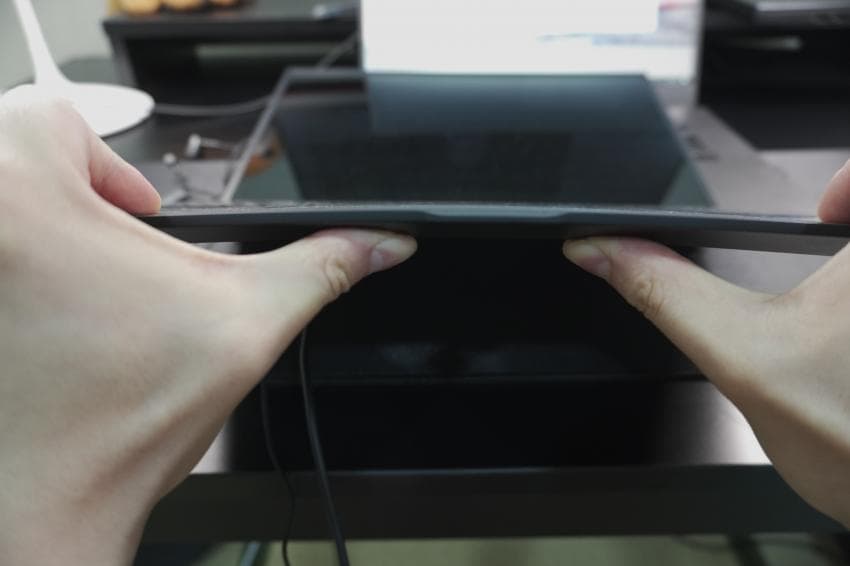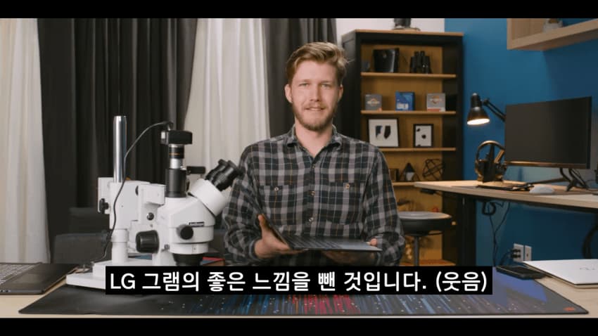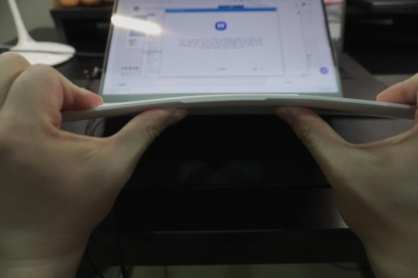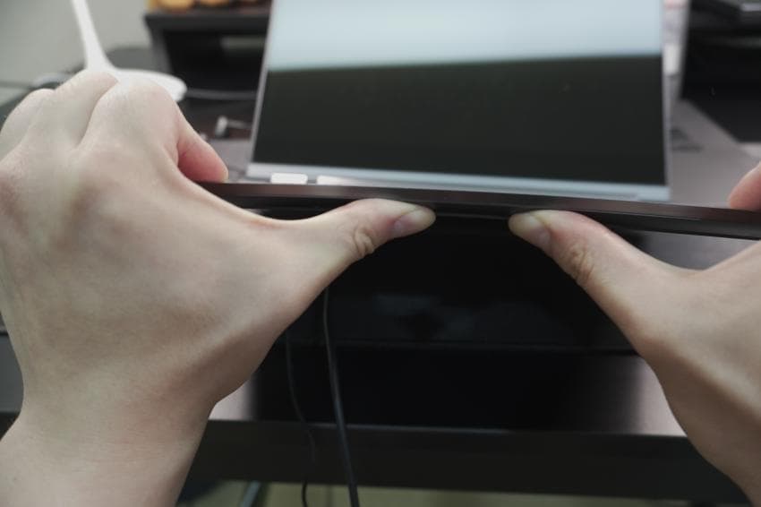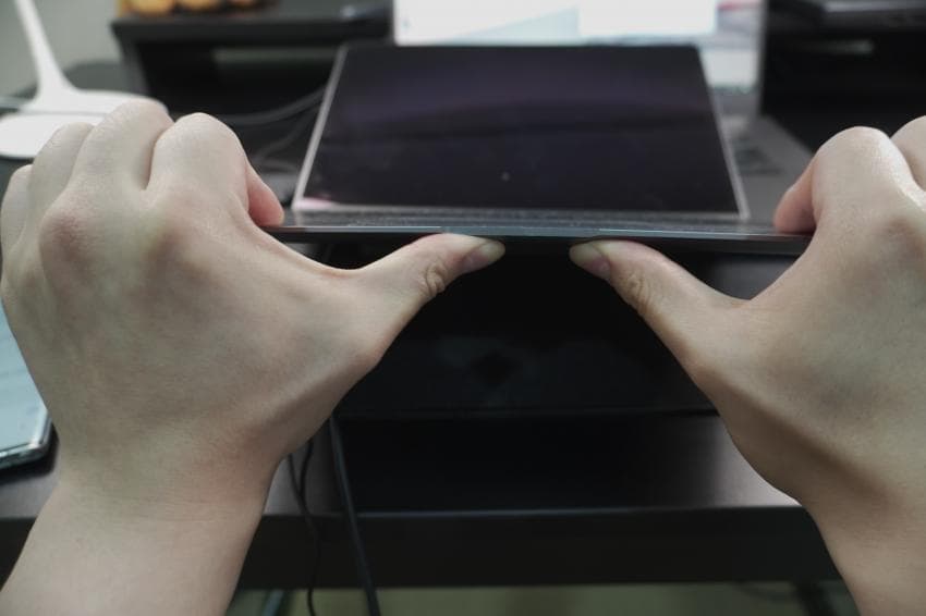 문제는 그램 따라하다가 몇 년 전에 강성이 엉망이 된 적이 있다는 겁니다. 반대로 그램은 액정이 휘어도 깨지지 않는다고 비교되며 크게 이슈가 된 적이 있었죠