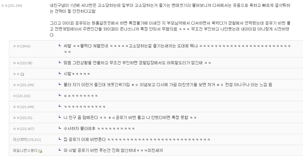 그리고 아이피 공유되는 원룸같은곳에서 하면 특정불가에 이ㅅㄲ는 지 부모님댁에서 디씨하면서 욕박다가 경찰에서 연락왔는데 공유기 비번 풀고 전면개방해놔서 주변인간들 와이파이 존나쓰니까 특정 안되서 무혐의뜸 ㅋㅋㅋ 무조건 부인하고 나안했는데 내아이피 아니랑게 시전하랜다