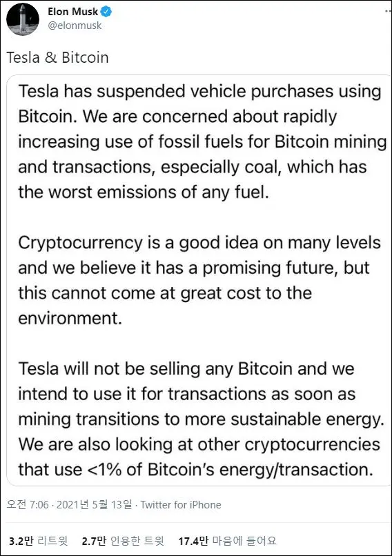해석해 주면 테슬라 구매시 비트코인 결제를 안하겠다는 소리다.