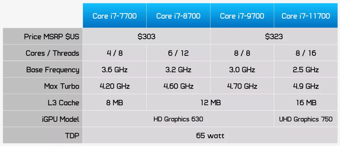 예를 들어, 65w Core i7-7700은 기본 클럭과 부스트 클럭 사이에 17%의 차이를 보였지만, 65w Core i7-8700에서는 그 수치가 44%로 증가했으며, 이제 우리는 Core i7-11700과 함께 96%의 놀라운 차이를 보이고 있습니다.