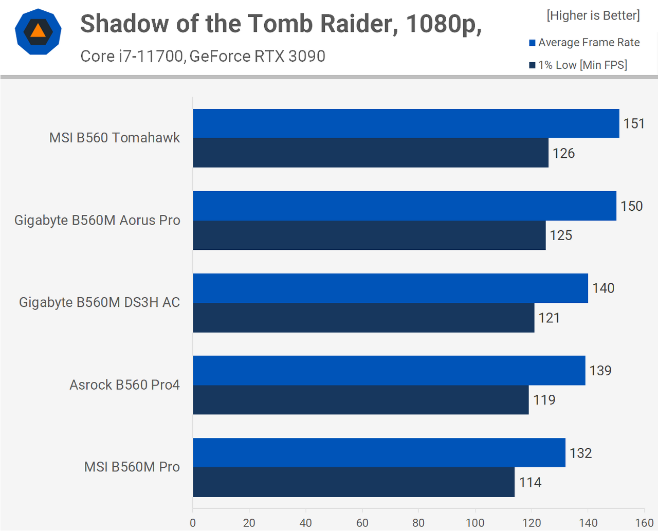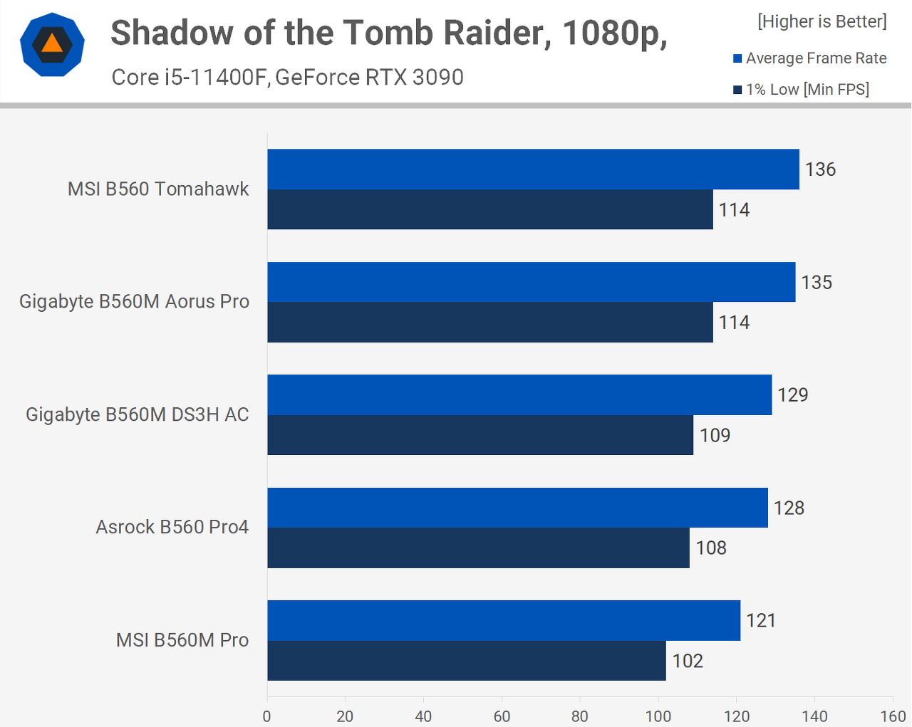 순전히 게임에만 집중하신 분들에게는 적어도 11400F를 초과하지 않는 대부분의 게임에서 그 차이가 크지 않습니다. Shadow of the Tomb Raider로 테스트한 결과 B560M Pro에서 Tomahawk로 성능이 12% 향상되었습니다. 이는 여전히 합리적인 차이이지만 Cinebench에서 본 35% 이득에 가깝지는 않습니다.