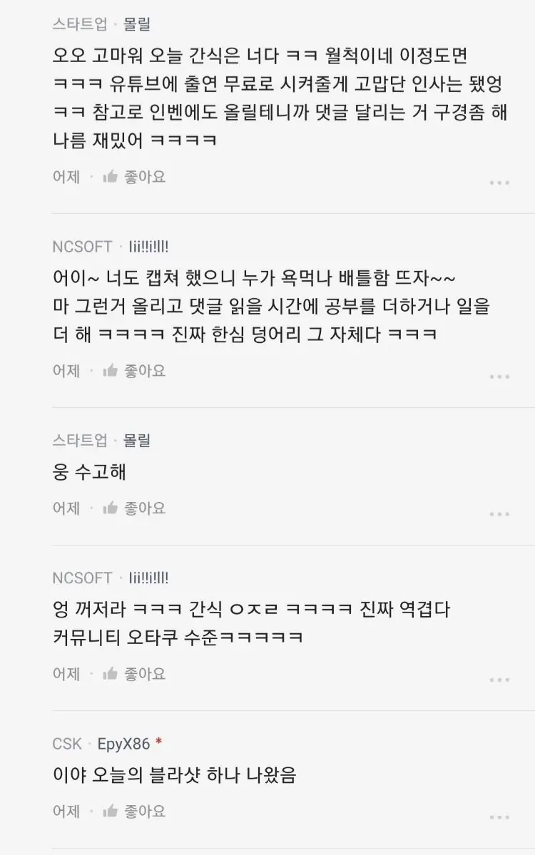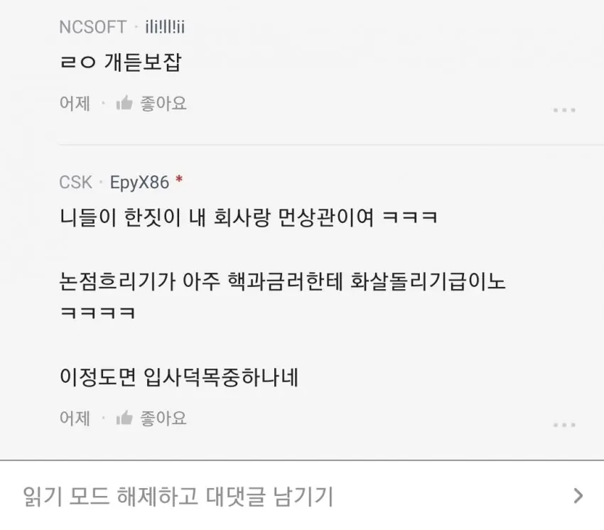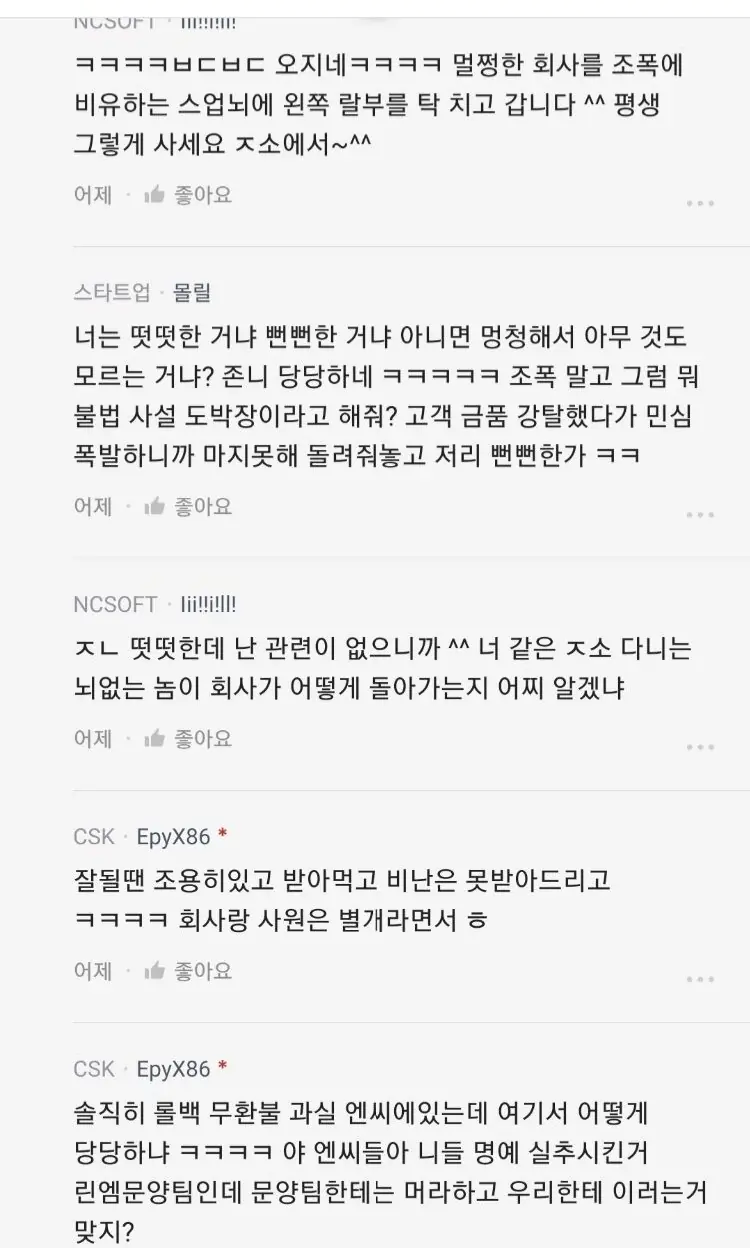 진짜 엔씨소프트 직원 인성수준 개 역겹다 ㅋㅋㅋㅋ 회사 잘 돌아가긋다 ㅋㅋㅋㅋ