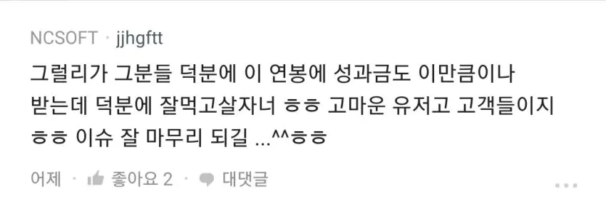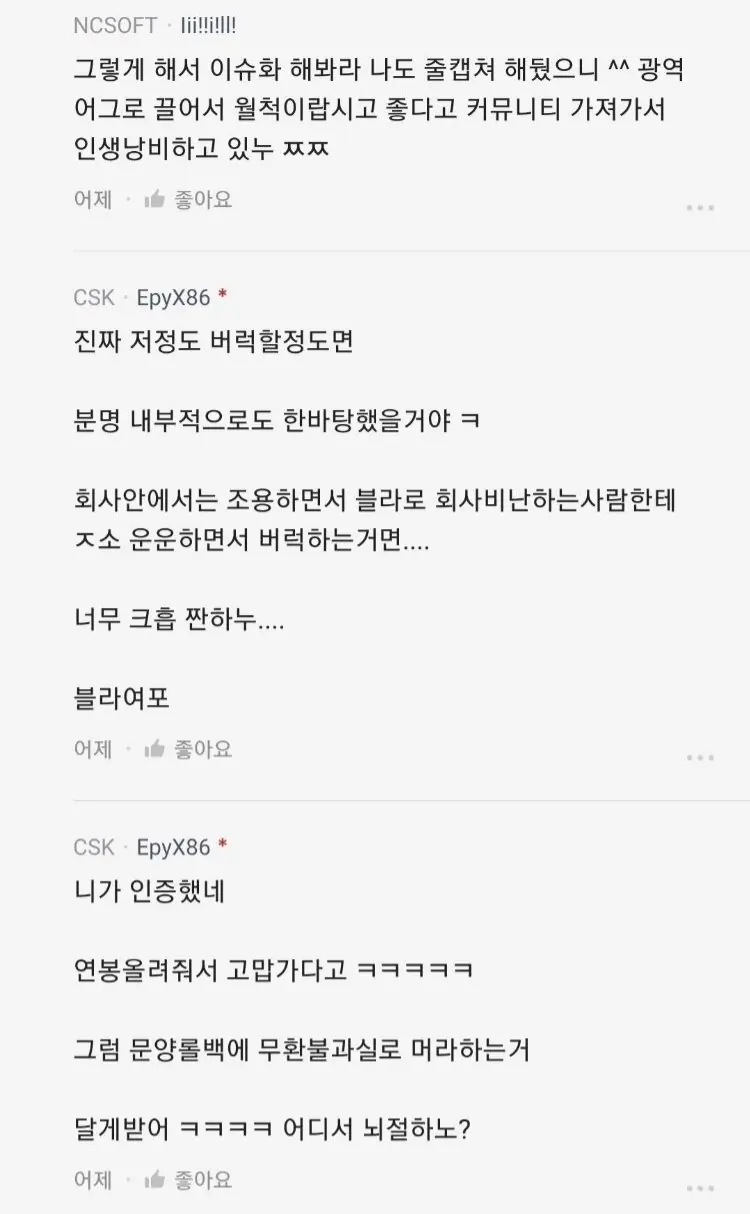다른 엔씨직원들도 덩달아 욕먹길래 불쌍하다 생각했는데 그저 똑같은놈들이었네 쳐망해라 병신운영게임