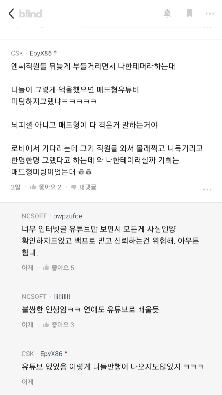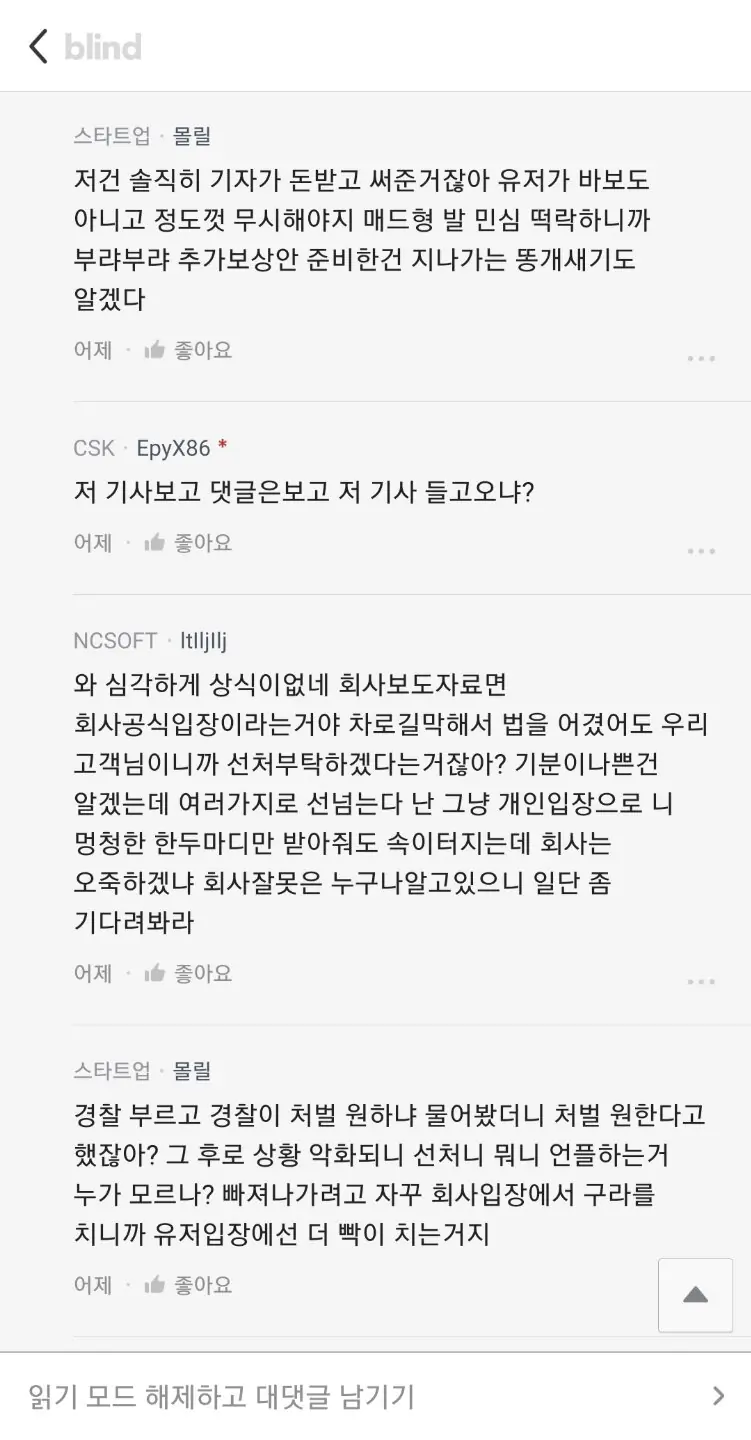 말단 직원도 익명믿고 저렇게 나댈정도니 회사분위기? 안봐도 그냥 인간극장이지ㅋㅋ 진짜 김택진이랑 그 밑의 얘들 싸그리 대국민사과 안하는이상 아니다 해도 여론돌리기 이미 늦었지
