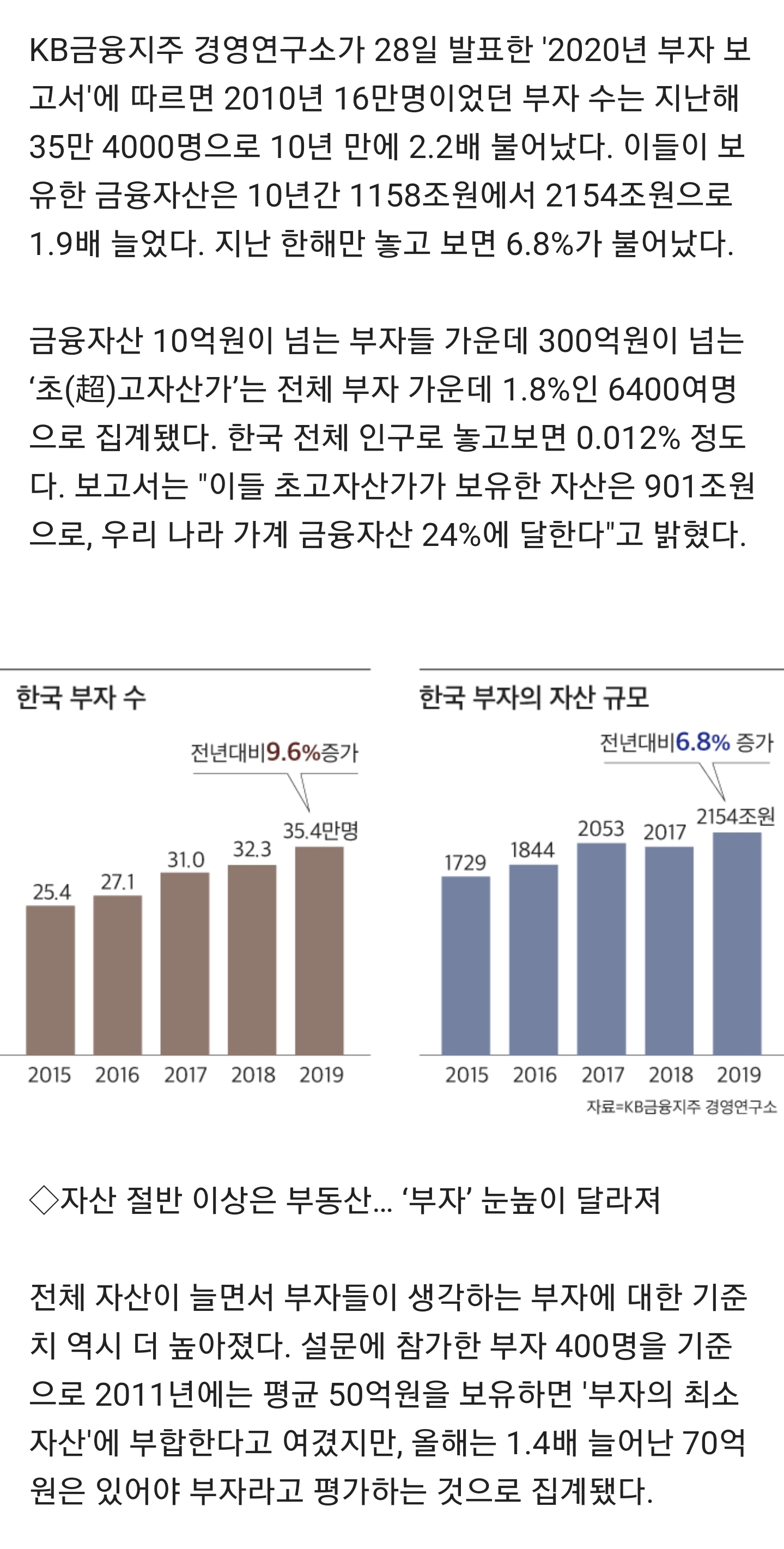 먼저 부자의 정의부터 내려야지. KB금융지주 경영연구소 조사에 따르면 약 70억의 자산은 있어야 부자라고 불릴 수 있다고 함. 최소 70억.