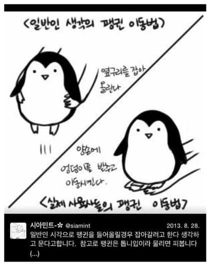 일반인이 생각하는 방법으로 펭귄을 들어올릴 경우 문다고 한다.