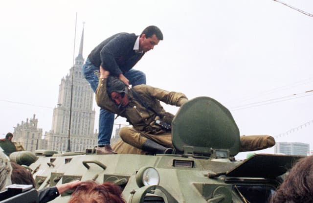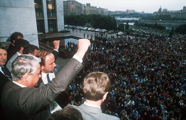 1991년 8월, 쿠데타 세력이 완전히 철수한 직후에 모스크바에서 열린 축하행사와 폭력사태로 희생된 사람들을 추모하는 의식.