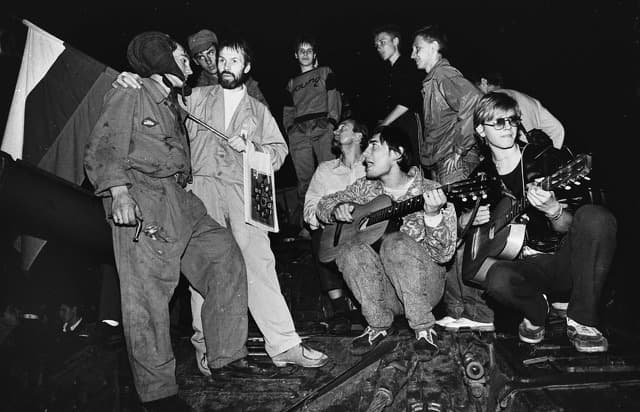 1991년 8월 20일, 모스크바의 러시아 대통령 관저 앞에서 시민들이 음악을 연주하며 한 병사와 이야기를 나누고 있다.