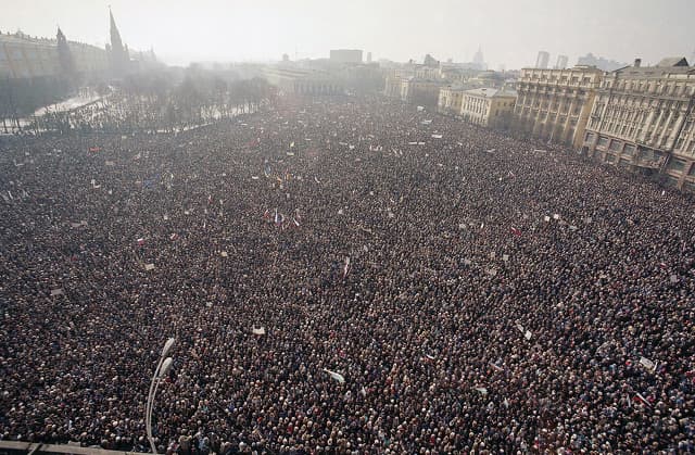 1991년 3월 10일, 고르바초프 대통령과 그의 측근들의 퇴진을 요구하며 크렘린 궁 옆의 마네쥐나야 광장에 운집한