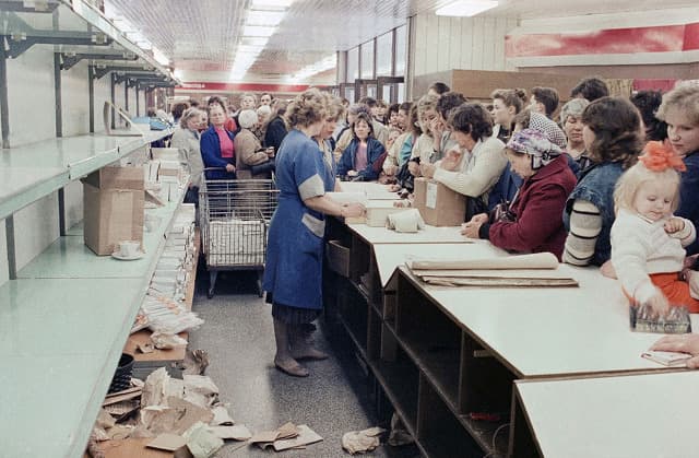 1990년 4월 27일, 빌뉴스의 중심지에 위치한 상점에서 시민들이 찻잔을 사고 있다.