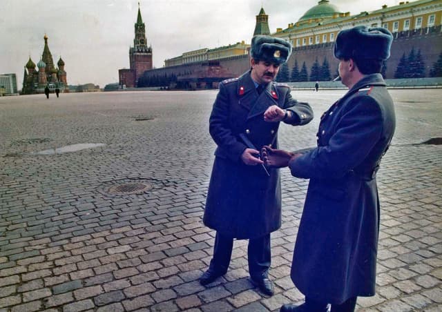 1991년 3월 27일, 한산한 붉은 광장을 지키고 있는 소련경찰들.