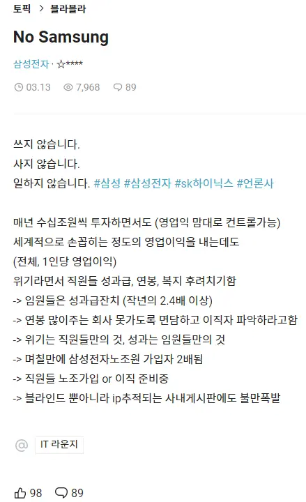 -> 블라인드 뿐아니라 ip추적되는 사내게시판에도 불만폭발
