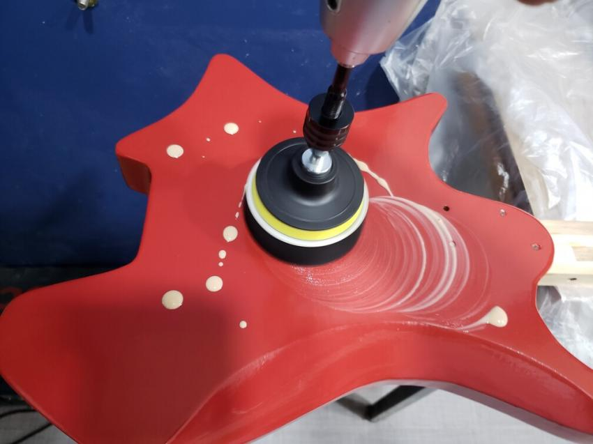 전동드라이버에 원형 스펀지를 물려서 만든 간이 광택작업기로 컴파운드를 뿌리고 빙글빙글 돌려줍니다