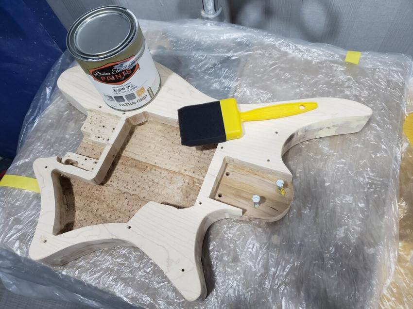 이제 피니시를 올려야하는데 기타바디가 바닥에 자꾸닿아서 애써칠한 피니시가 엉망이 됩니다