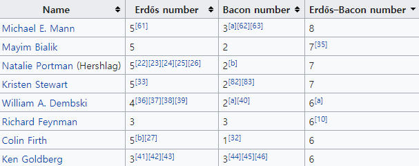 유명한 수학자 중 에르되시 수가 가장 높은 사람은 5였고 대부분은 8 이내로 정리되었다