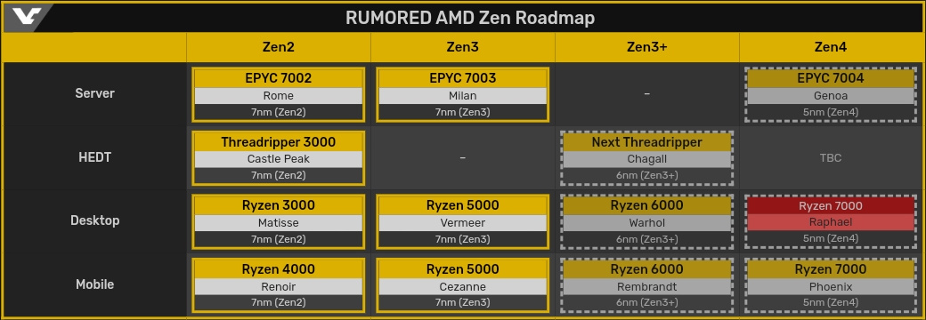 AMD Raphael은 Ryzen 7000 시리즈를 지원할 가능성이 높으며, Genoa (EPYC) 및 Pheonix (APU)와 함께 또 다른 Zen4 제품이 될 것입니다. AMD Raphael은 2022년 4분기 말에 출시될 것이라고 이전에 보고되었습니다. 즉, Raphael은 Raptor Lake인 Alder Lake의 후속 제품과 경쟁할 것입니다.
