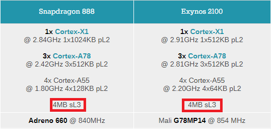 엑시노스2100랑 스냅드래곤888은 L3캐시 4MB 조합으로 나왔습니다...;