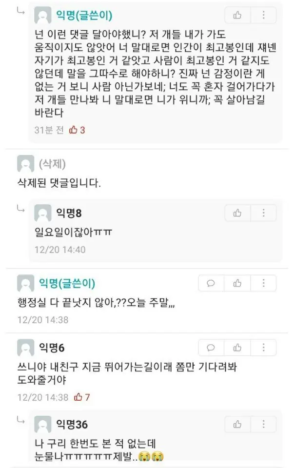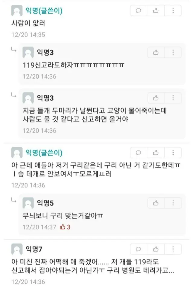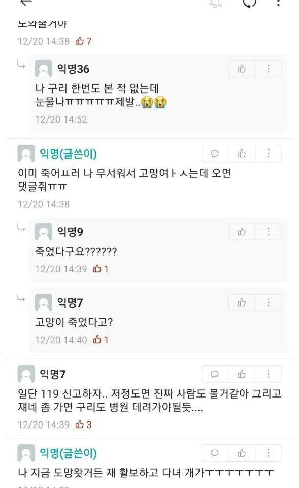 맨날 학교올라갈 때 야옹야옹 울고 사람손타서 얼굴부비던애가 눈앞에서 저렇게 죽었다고 생각해보면 위에 쿨찐들처럼은 말못하지 ㅅㅂ