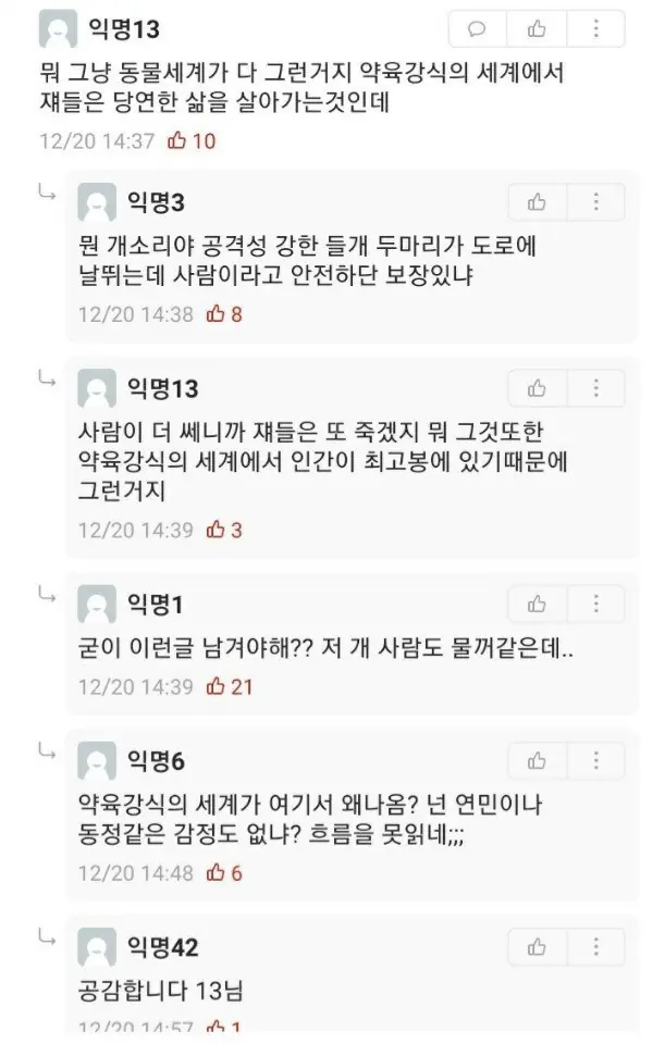 그냥 자연에서 살던 길고양이가 다른 동물들에게 죽는건 어쩔수 없지만 들개는 쫓아내야할듯. 사람 사는 곳인데. 저게 고양이가 아니라 사람에게까지 피해간다 저게 진짜 사람 물기라도 하면