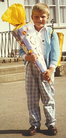 A : Schultüte(슐튀테)입니다. 독일, 오스트리아 등지의 전통 선물로 안에는 사탕과 학용품이 가득 차 있으며 초등학교 입학 첫날 받습니다. 대학교 입학식에 작은 슐튀테를 주는 장난을 치기도 합니다. 밑의 사진 참조