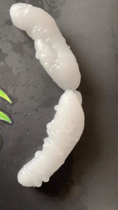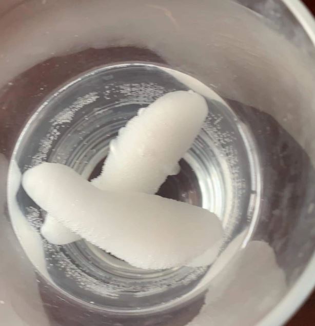 A : 탈지분유에서 나온 우유 고형물이 알긴산나트륨과 결합해 껌 형태가 된 것 입니다. 제품이 추운곳에 오랫동안 보관되었을 확률이 높습니다.