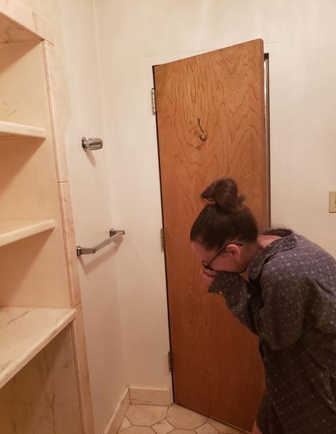 Q : 문 뒤에 있는 벽에 샤워기 손잡이가 있어 돌리면 물 흐르는 소리가 들리긴 해! 이게 뭐야???