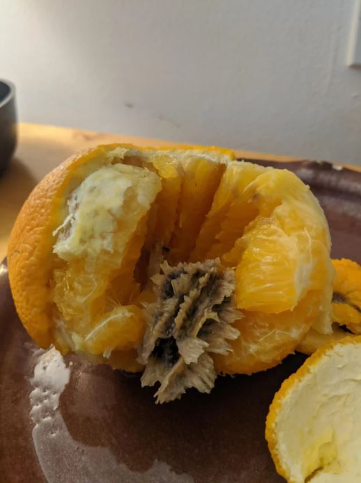 A : 오렌지 안에 가끔 있는 작은 오렌지 부분이 먼저 부패한 경우입니다. 알터타리아라는 감귤류에 생기는 곰팡이성 감염병 입니다.