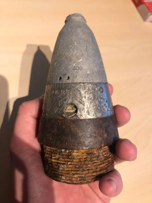 A : 제2차 세계대전의 75mm 포탄입니다. 강선의 흔적이 있는걸보면 실제로 발사 된 탄이 맞습니다. 위험하니 경찰을 부르세요.
