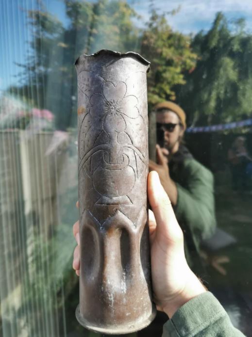 A : 트렌치 아트(참호예술)이라고 불리우는 예술의 한 종류입니다. 전쟁중에 탄피와 헬멧등에 새겨진 예술품으로, 높은 가치가 있는 작품입니다.