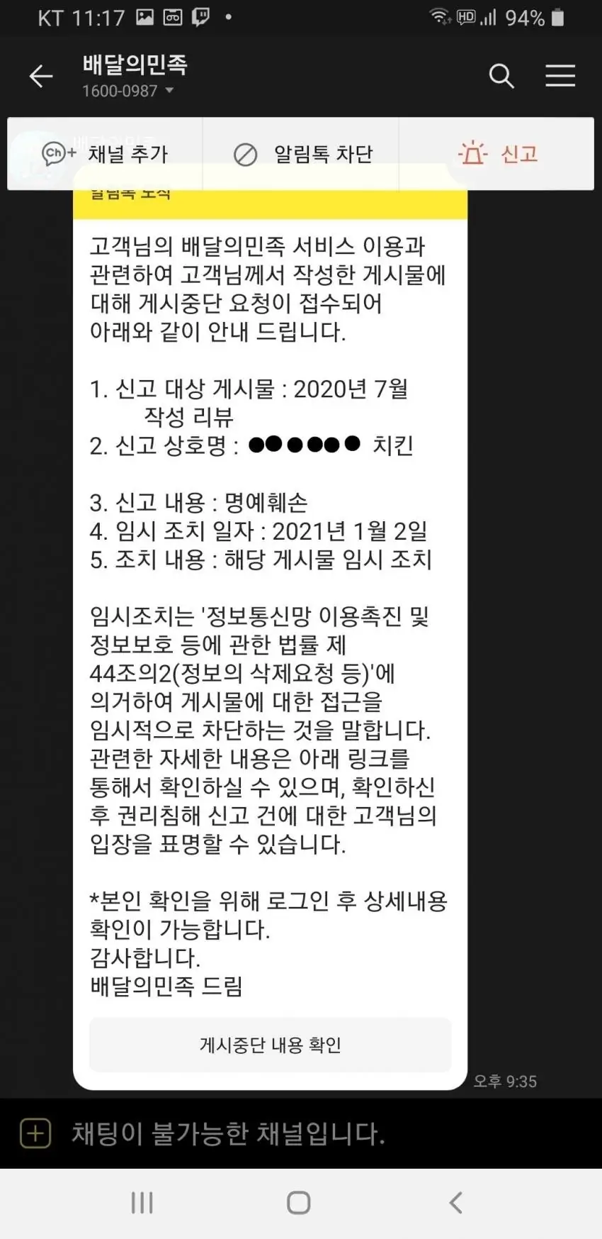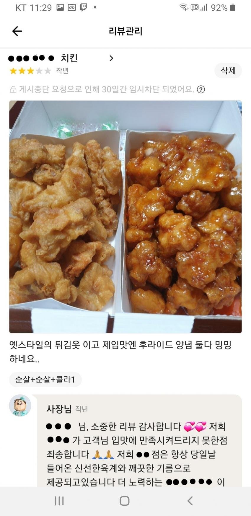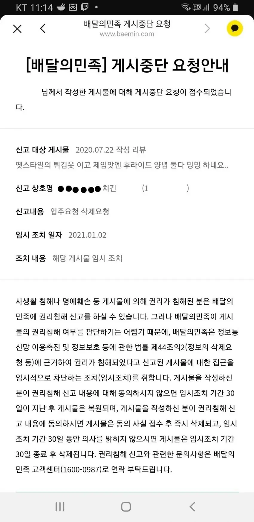 치킨 밍밍하다고 한걸 무슨 명예훼손 명목으로 메달아서 삭제 요청한 거였음