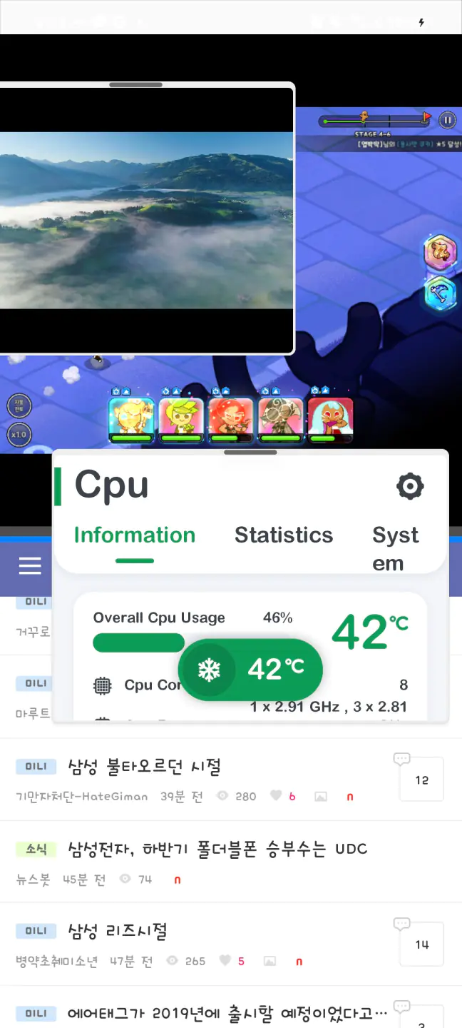 사진은 유선충전기로 25w 충전 + 쿠킹덤이랑 미코 분할화면 + 유투브 4k영상재생 + 온도체크 어플입니다 멀티 지대로 돌려봤는데요 딱히 덥지않은 상온의 실내에서 테스트 해봤습니다 S21노멀 써